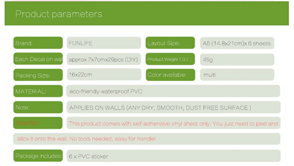 Feature :This product comes with self-adhensive vinyl sheet only .You just need to peel and stick it on to the wall , No tools needed ,easy for handle !