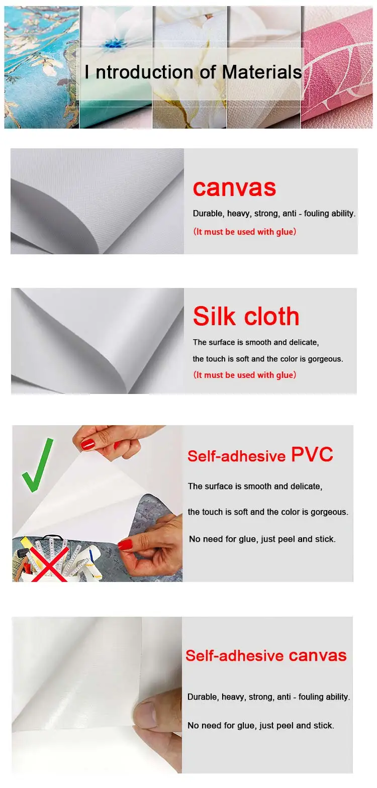 Self-adhesive wallpaper: self-adhesive PVC, self-adhesive canvas (no glue required)
