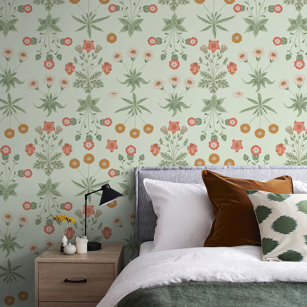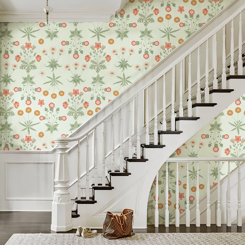 2. Apply Peel-Stick Wallpaper to the wall, beginning in the corner. (Do not peel all the backing all at once, peel off a few inches at a time, slowly stick it to the wall, and then continue to peel off a little more)