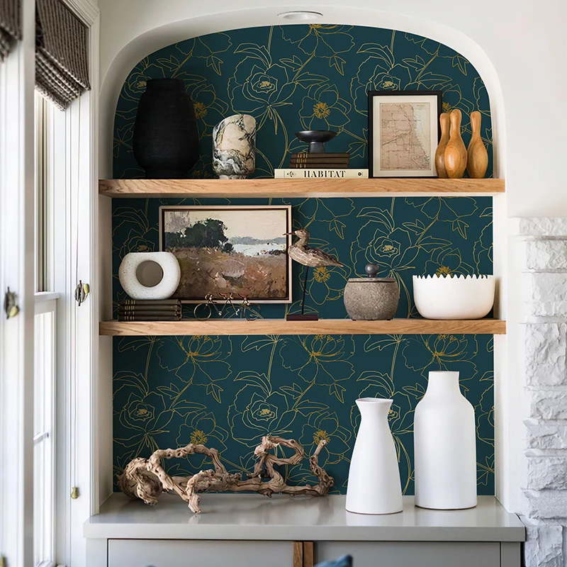 2. Apply Peel-Stick Wallpaper to the wall, beginning in the corner. (Do not peel all the backing all at once, peel off a few inches at a time, slowly stick it to the wall, and then continue to peel off a little more)