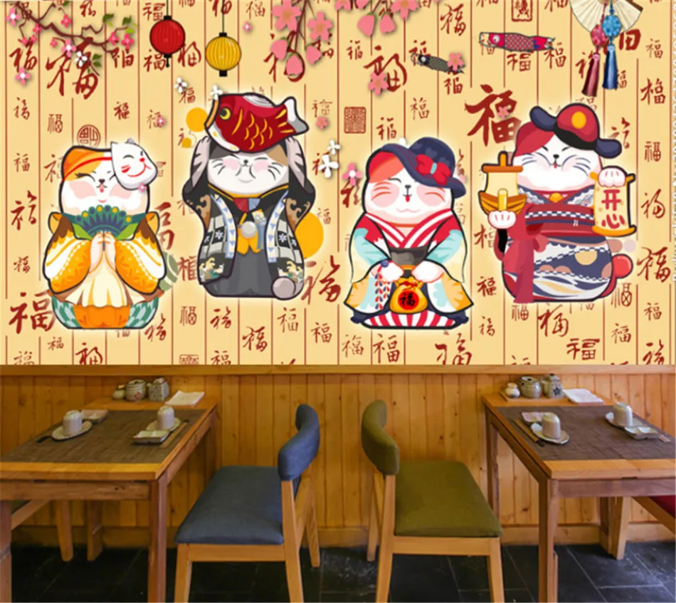 Sakura Lucky Cat Japanese Culture Sushi Gourmet Restaurant Wallpapers Industrial Decor Wood Grain Background Wall Paper Mural