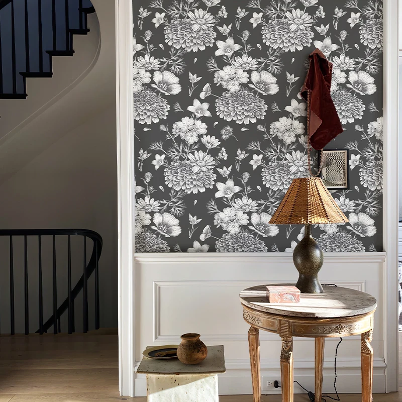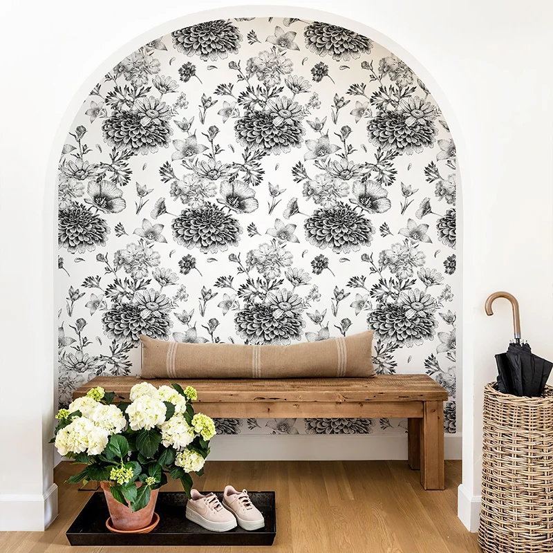 2. Apply Peel-Stick Wallpaper to the wall, beginning in the corner. (Do not peel all the backing all at once, peel off a few inches at a time, slowly stick it to the wall, and then continue to peel off a little more)