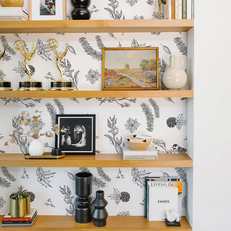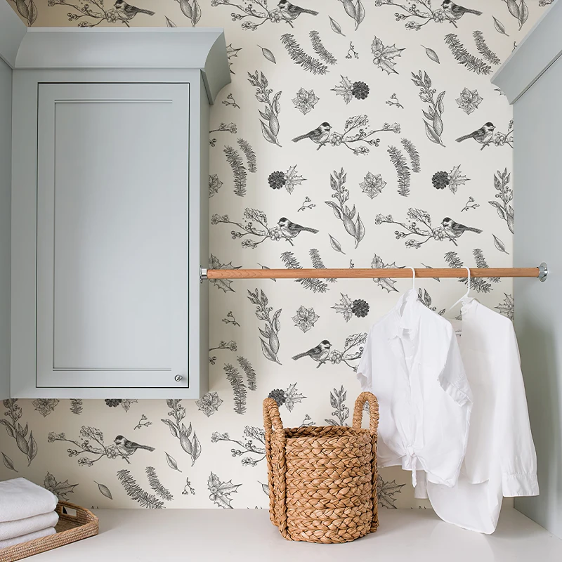 2. Apply Peel-Stick Wallpaper to the wall, beginning in the corner. (Do not peel all the backing all at once, peel off a few inches at a time, slowly stick it to the wall, and then continue to peel off a little more)